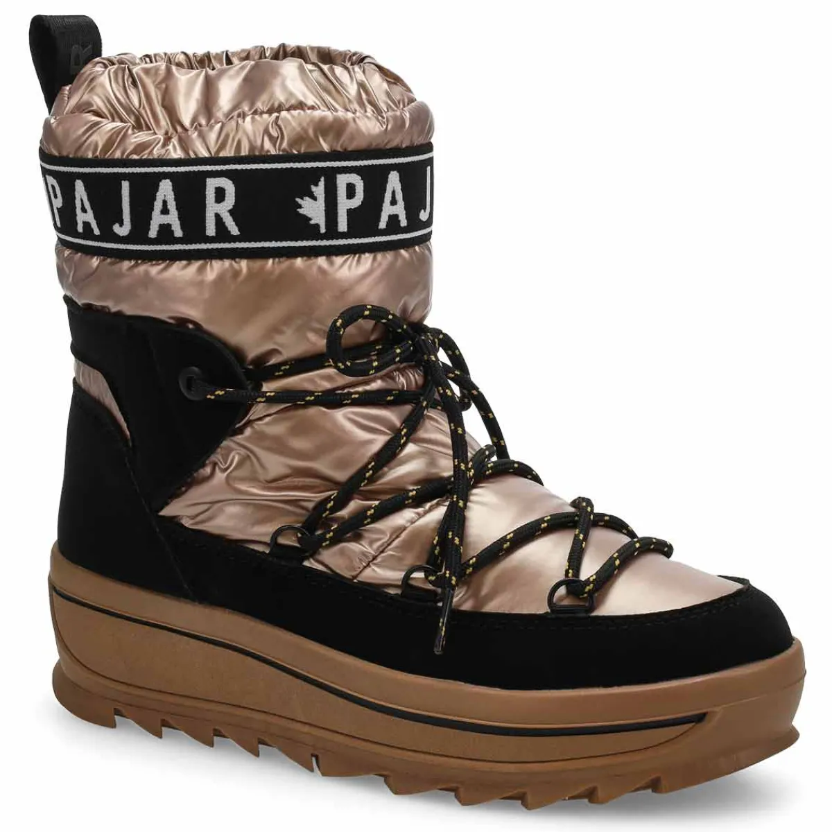The Galaxy rose gold Waterproof Winter Boot from Pajar features a combination of nylon and vegan nubuck upper. The upper is entirely seam-sealed and comfort rated to -30°C to keep your feet snug all winter long with a mudguard. Featuring the signature Pajar Canada thermal rubber traction lug sole with 2-inch platform and will help get you through icy streets in style keeping you surefooted all the while.