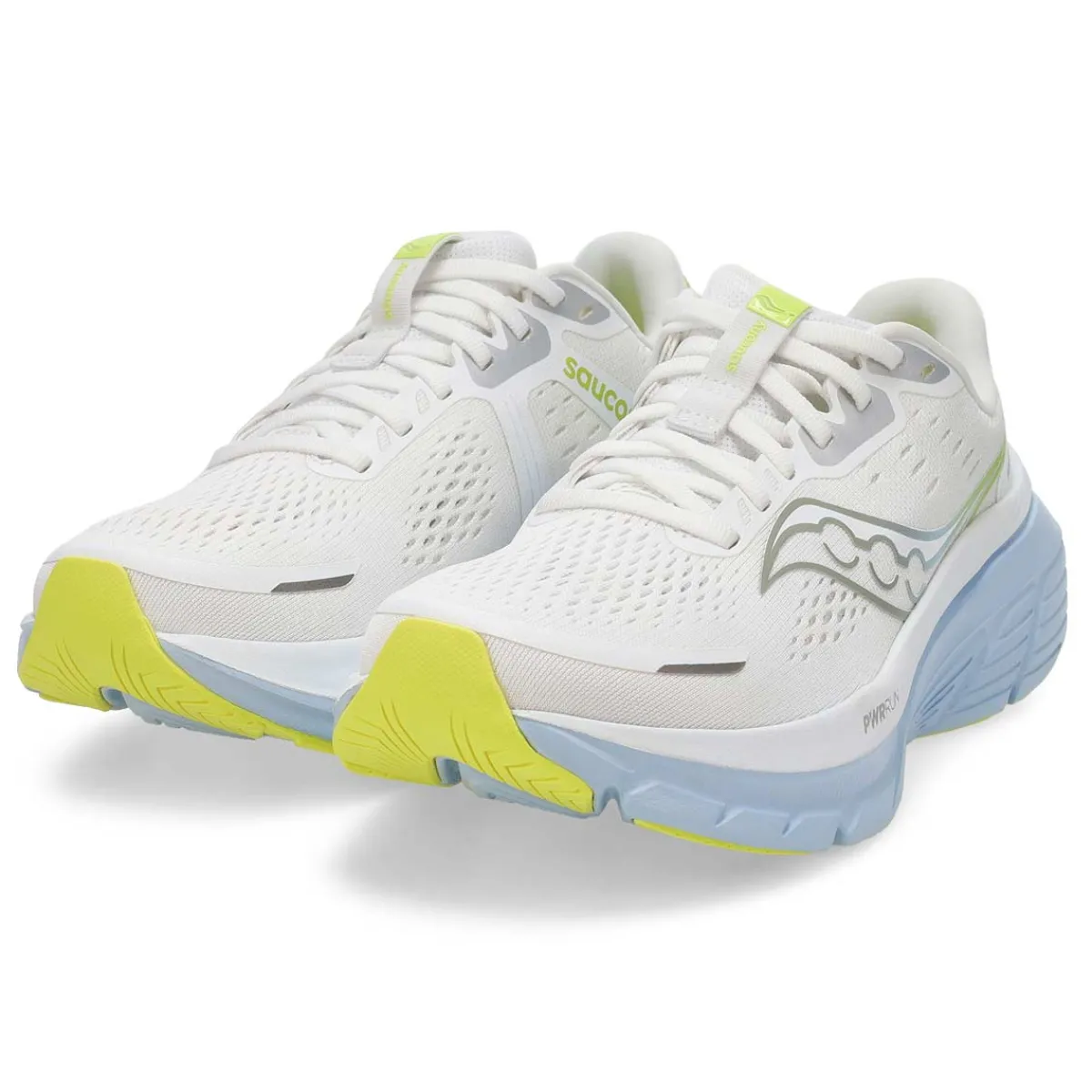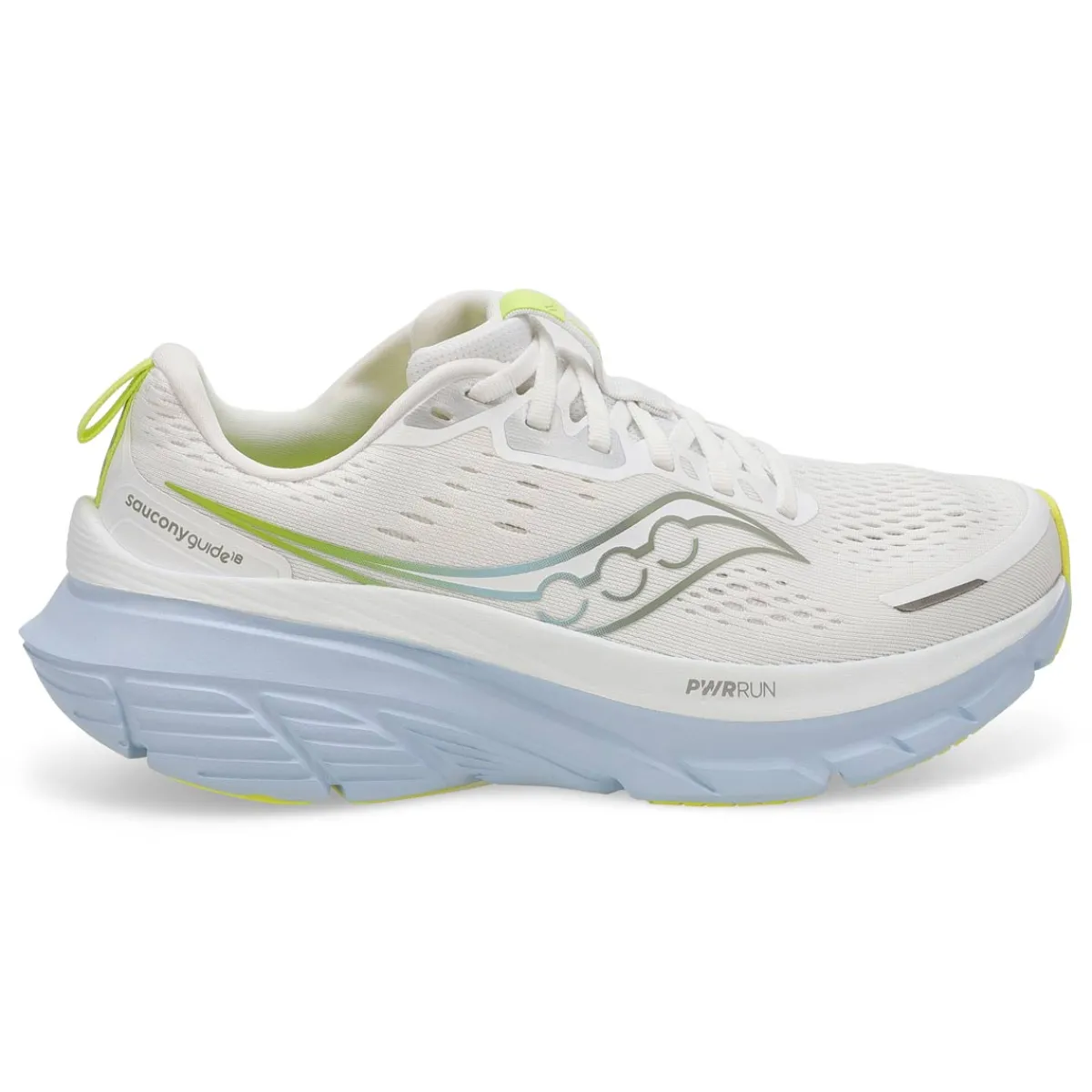 Run with Confidence. The Guide 18 white / ice melt Perfromance Sneaker from Saucony elevates comfort to new heights with enhanced PWRRUN cushioning, providing more protection than ever before. The innovative CenterPath technology ensures you stay secure and confident with every step.This daily running shoe also features a redesigned upper with breathable mesh for improved airflow and a padded heel collar for a snug fit. Go further with the Guide 18.