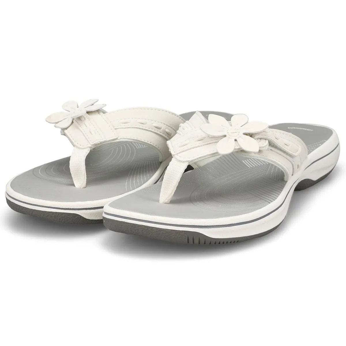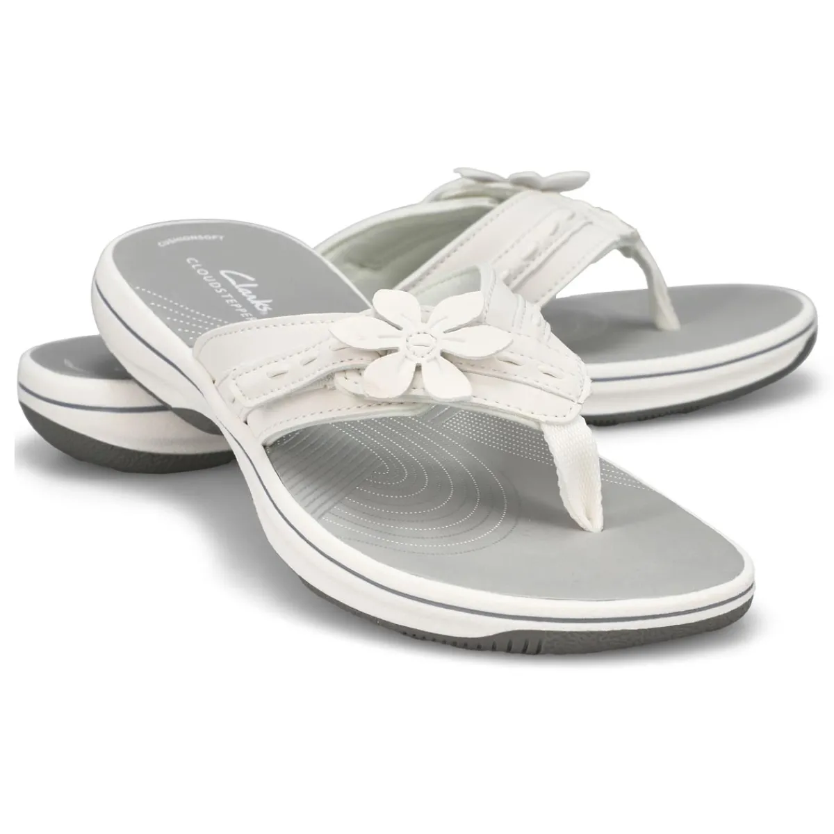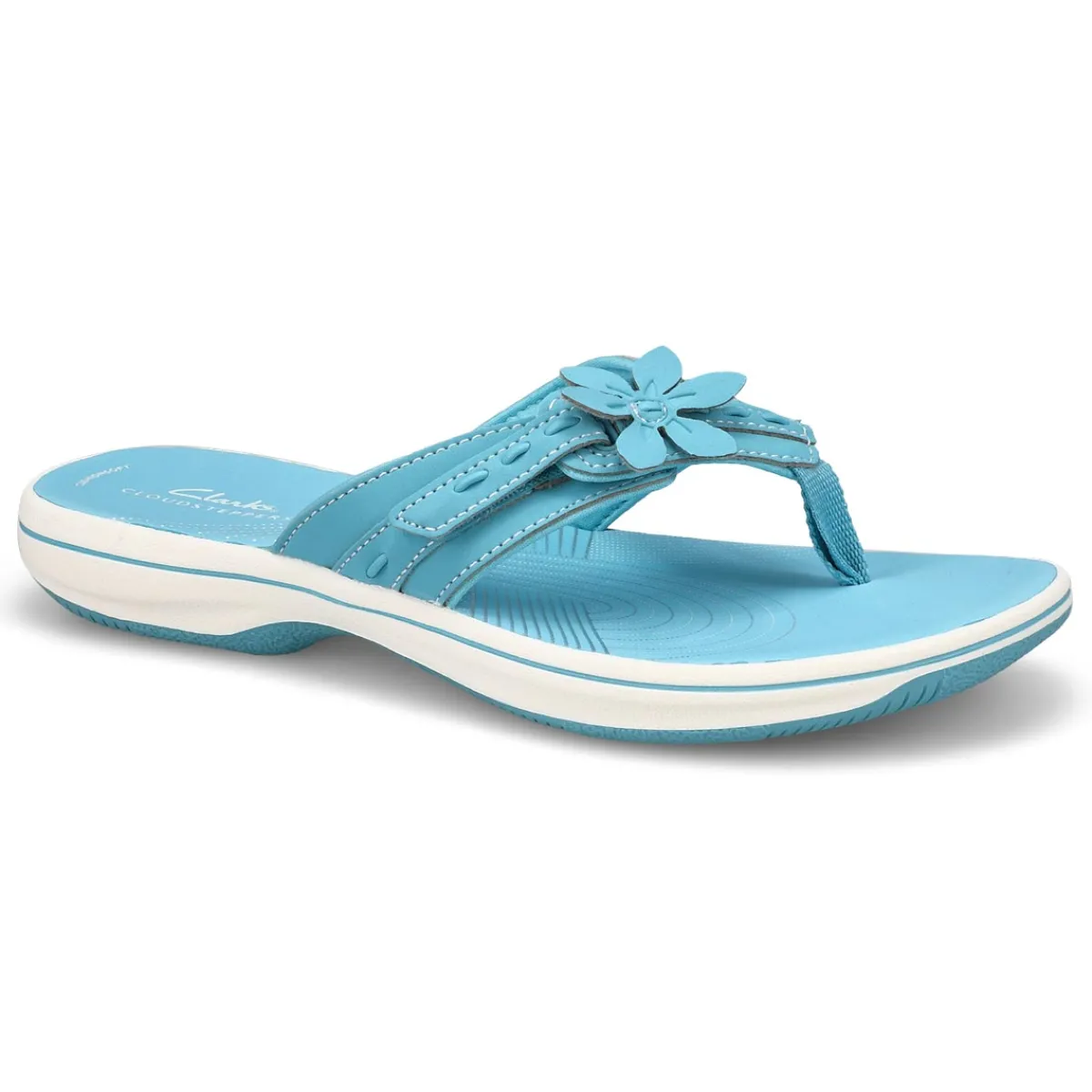 Topped with a pretty flower detail, the Breeze Opal sky blue thong flip-fllop sandal from Clarks is part of their Cloudsteppers collection, so you know that total underfoot comfort is a sure thing. It’s crafted with soft synthetic uppers for a skin-gentle feel, while grippy soles make for confident support and easy-breezy steps.