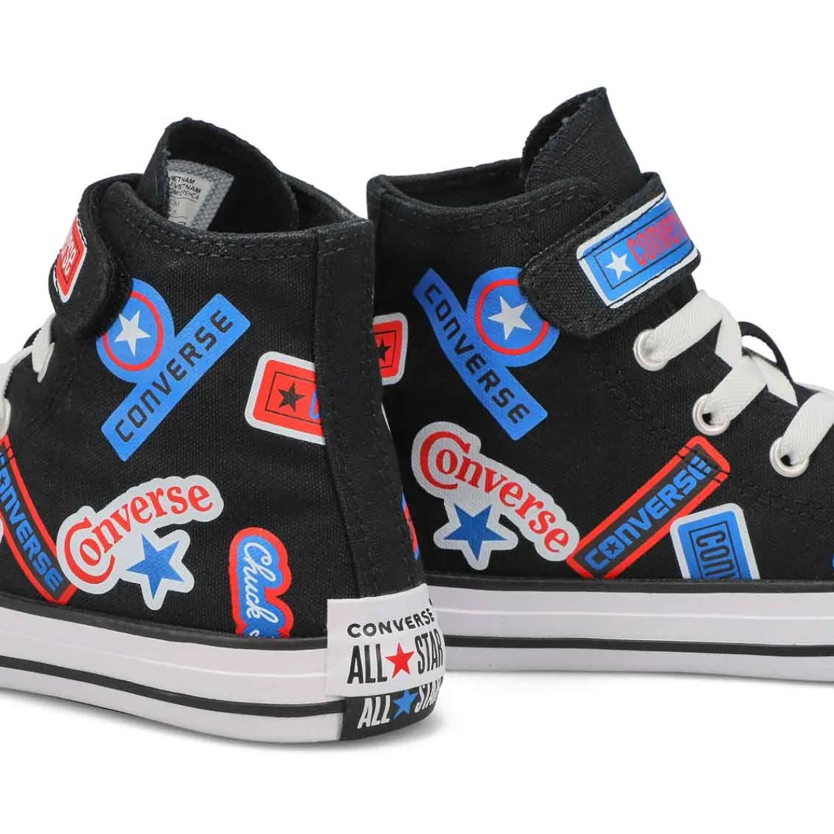 Add a playful sticker style to their look with the new Chuck Taylor All Star 1V Hi Top Sticker Stash black/ fever dream/ blue sneaker from Converse! These hi top Chucks feature allover sticker-themed graphics set against a soothing pastel canvas upper. Durable rubber outsole with signature diamond tread provides flexible traction.