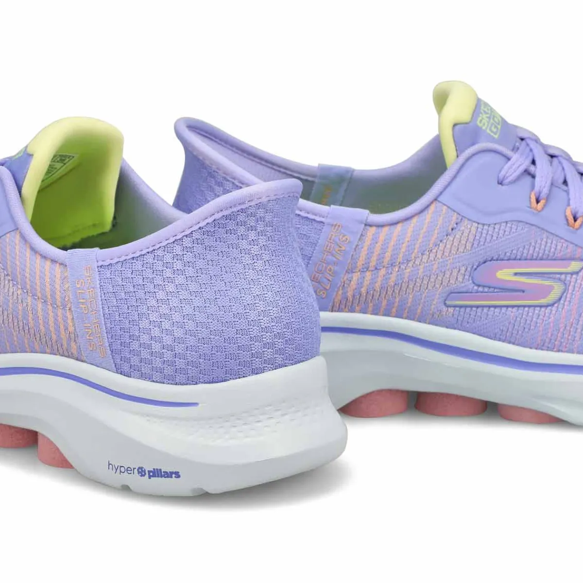 Walk in easy-wearing comfort with Skechers Hands Free Slip-ins GO WALK 7 lavender/ multi sneaker from Skechers. Designed with Skechers exclusive Heel Pillow holds your foot securely in place. This hands-free walking slip-on features an engineered mesh upper with a laced front, Skechers Air-Cooled Memory Foam insole, lightweight ULTRA GO cushioning, and high-rebound Hyper Pillars for added support.