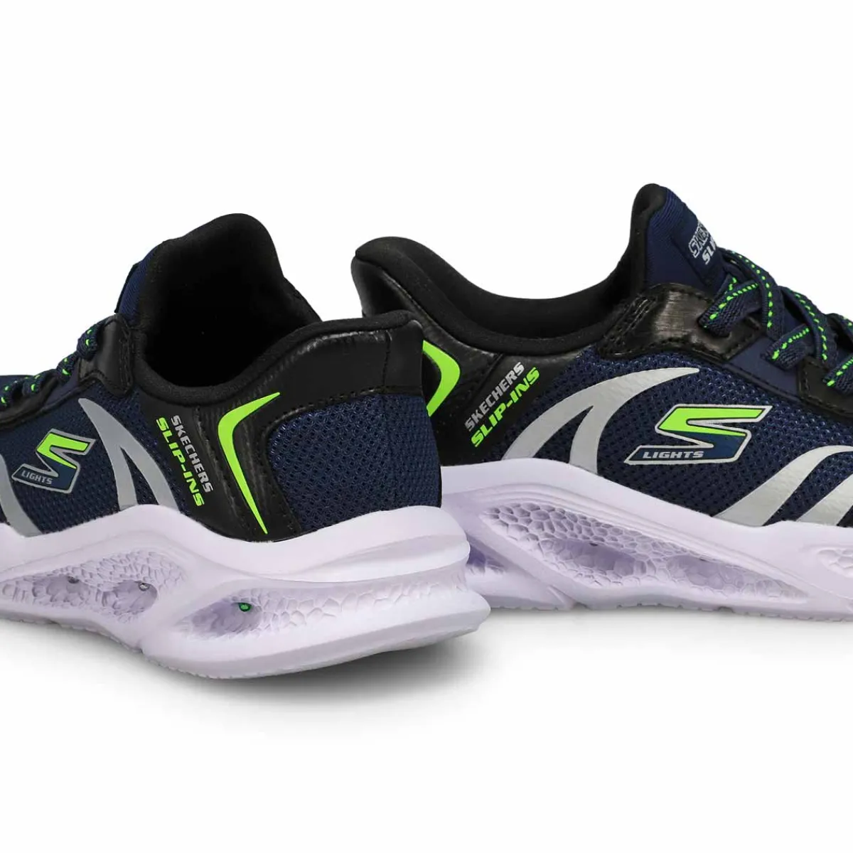 Illuminate your steps in sporty style and comfort with the Hands Free Slip-ins S-Lights: Meteor-Lights Brisk-Beams navy/ black sneaker from Skechers. Designed with Skechers’ exclusive Heel Pillow, this light-up slip-on features a mesh and metallic hotmelt overlay upper with stretch laces, Skechers Air-Cooled Memory Foam insole, and a shock-absorbing light-up midsole.