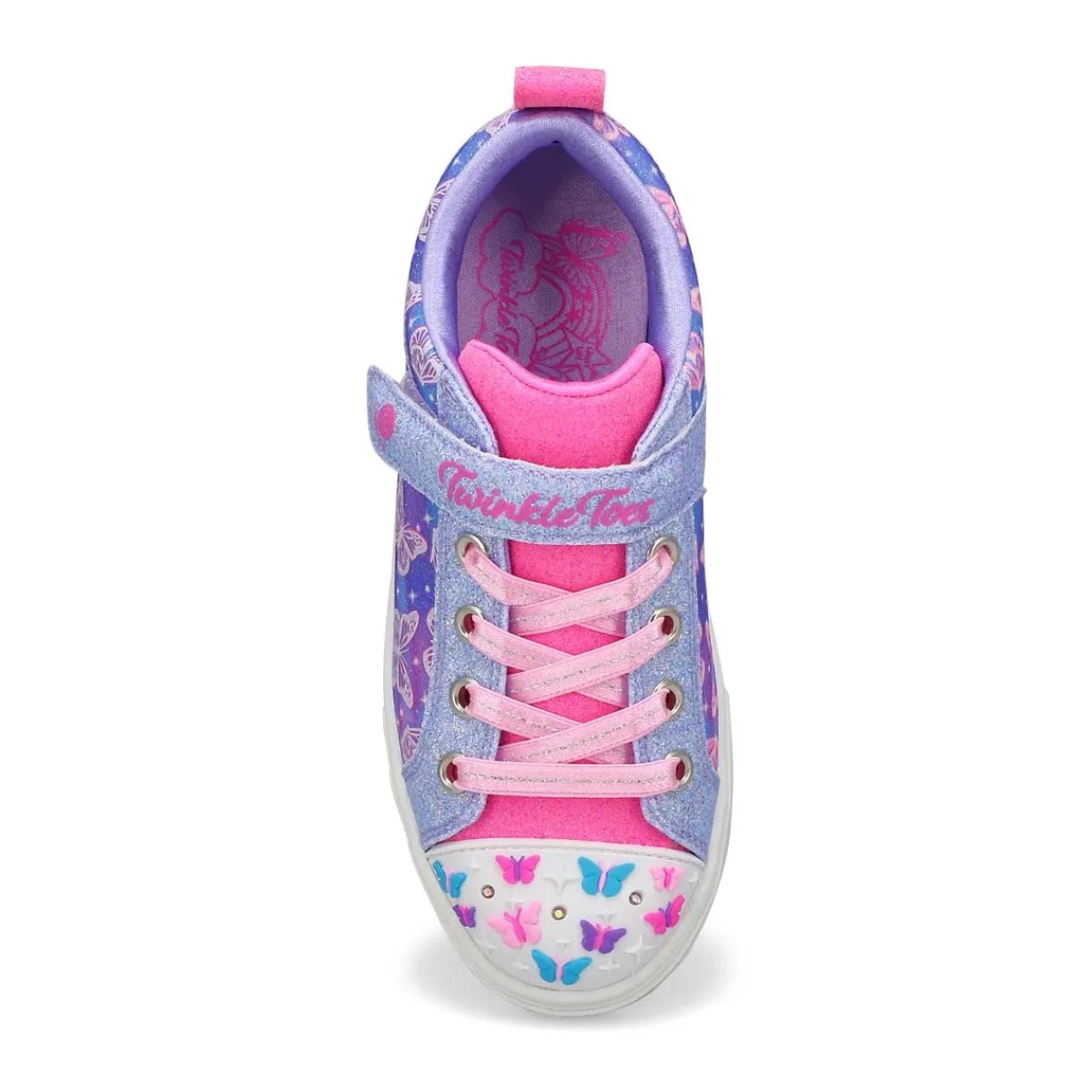 Take to the skies in magical style wearing Skechers Twinkle Toes Twinkle Sparks Ombre Flutter. This glittery lighted design features a rainbow print synthetic upper with butterflies. Stretch laces and an adjustable instep strap for a secure fit. Twinkle Toes light-up butterfly embellished toe cap. Shock-absorbing vulcanized midsole. Flexible traction outsole.