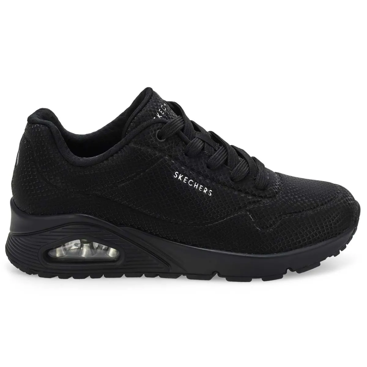 Walk on air in the wildly comfortable Street UNO Safari Time white/ leopard lace up sneaker from Skechers. This stretch-laced fashion sneaker features a duraleather upper with a leopard print midsole and lining, a Skechers Air-Cooled Memory Foam insole, and a visible Skech-Air airbag midsole. No Tie Fit – laces never come untied.