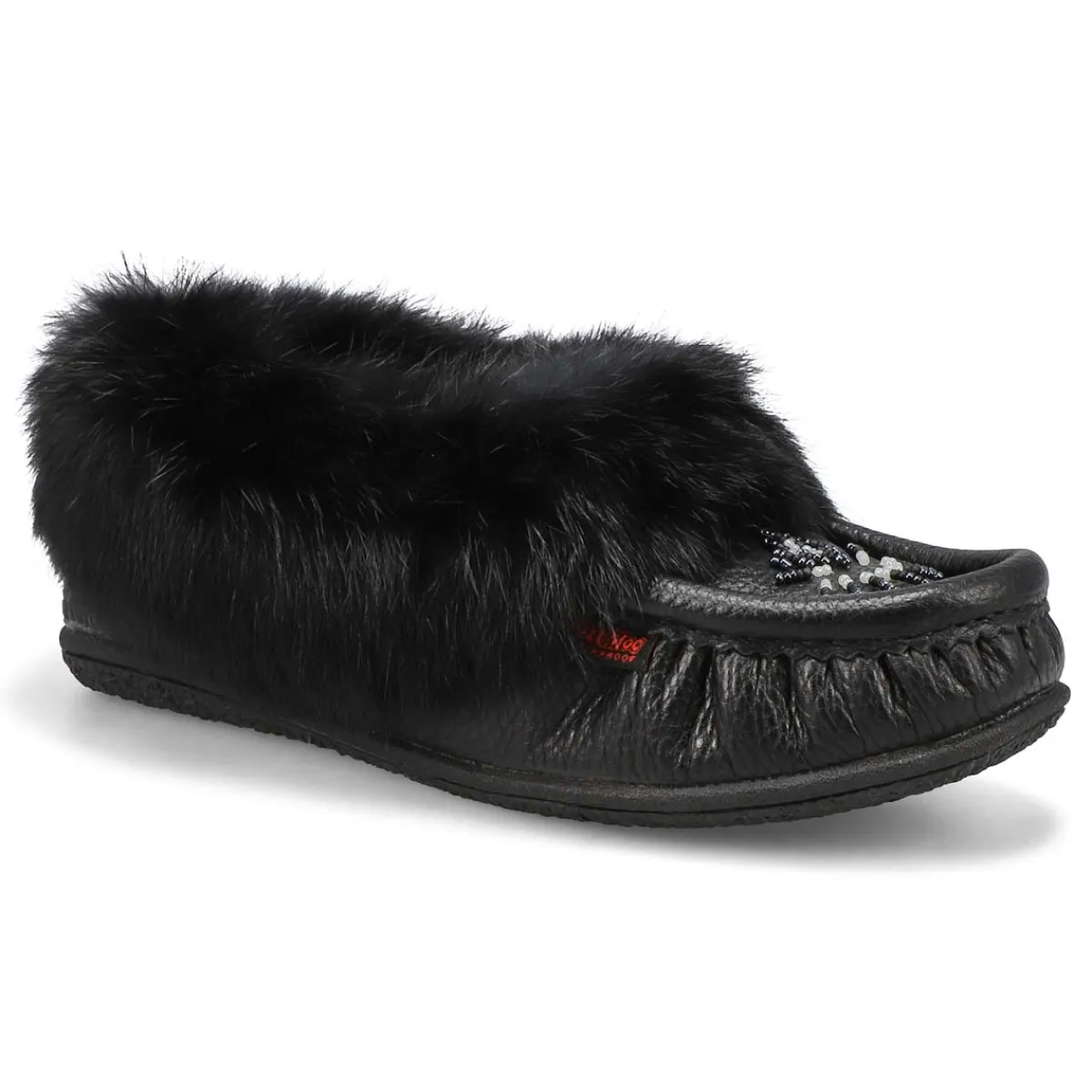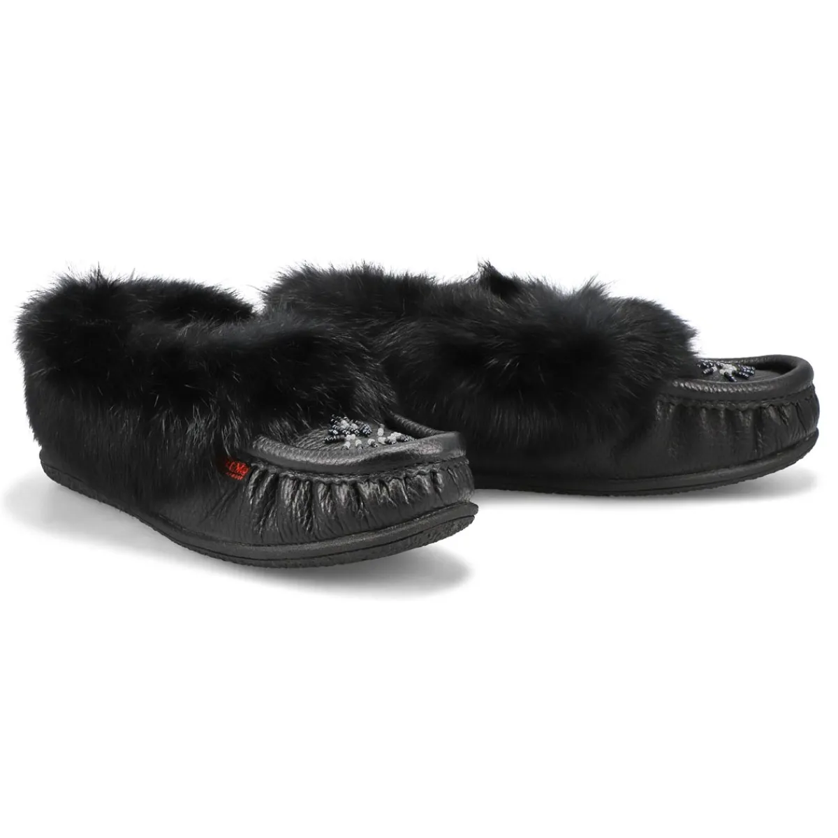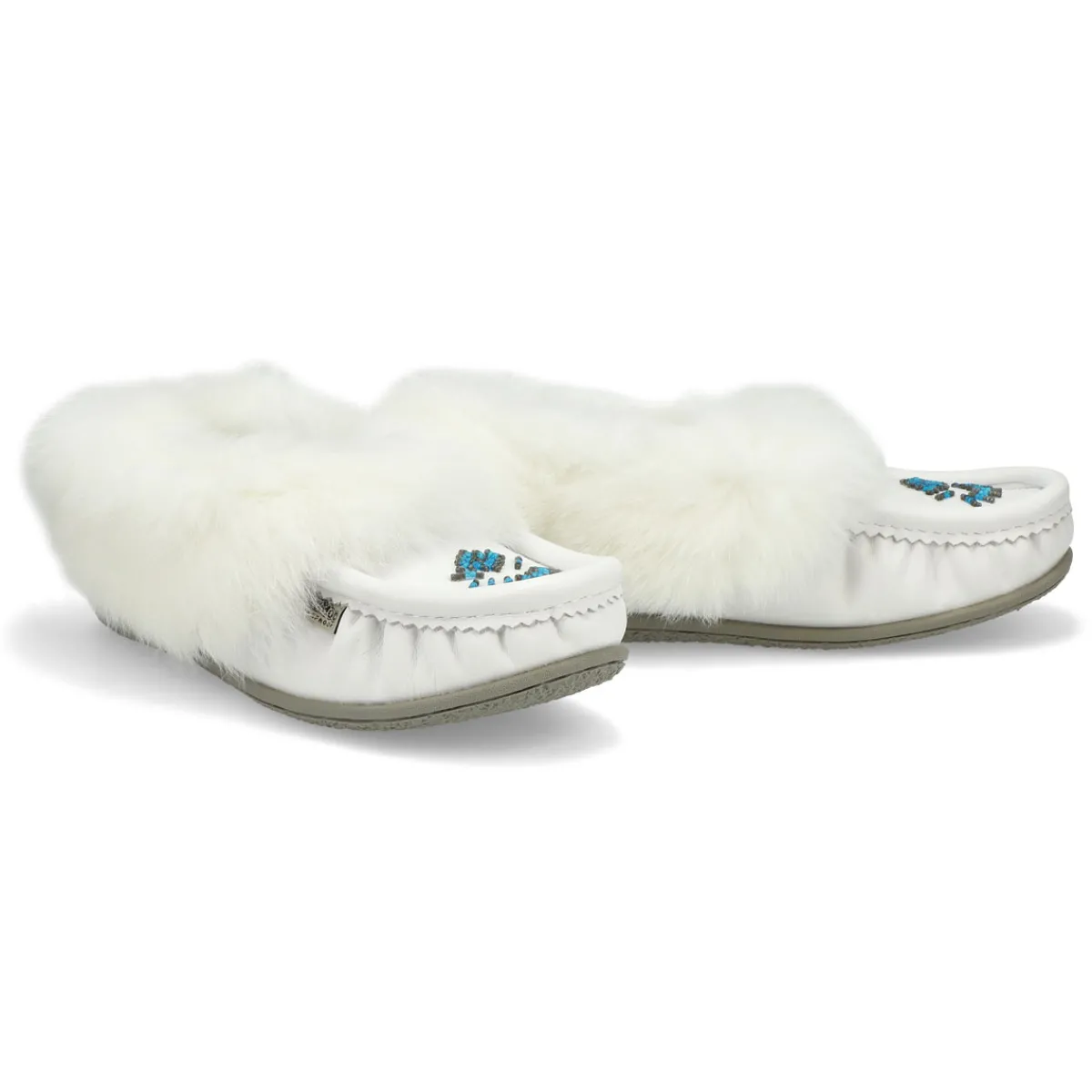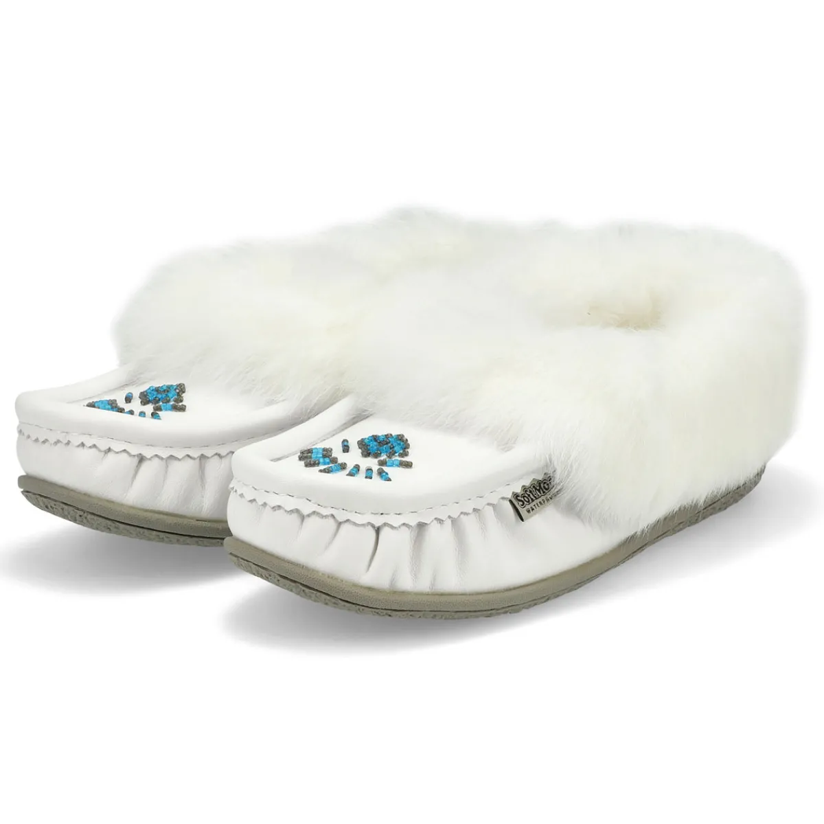 The SoftMoc Cute 5 leather white rabbit fur SoftMocs features a leather upper collared with genuine rabbit fur. The Cute 5 is designed with a new and inproved combination latex and memory foam insole, giving you superior rebound comfort.. New upgraded soft, plush lining surrounds the foot in comfort. The TPR outsole is great for durability. Slight dye transfer may occur during the first few wearings. Style is not made for snow or ice conditions.